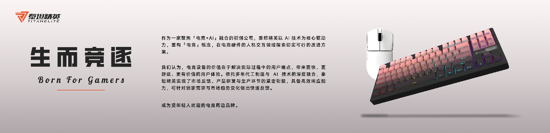 品牌简介/Brand Profile泰坦精英(TitanElite)是一家 2025 年于深圳成立的年轻电竞品牌。作为一家聚焦「电竞+AI」融合的初创公司,泰坦精英以 AI 技术为核心驱动力,重构「电竞」概念,在电竞硬件的人机交互领域探索切实可行的改进方案。我们认为,电竞设备的价值在于解决实际过程中的用户痛点,带来更快、更舒适、更有价值的用户体验。依托多年代工制造与 AI 技术的深度融合,泰坦精英实现了市场反馈、产品研发与生产环节的紧密衔接,具备高效响应能力,可针对玩家需求与市场趋势变化做出快速反馈。TitanElite is a young esports brand founded in Shenzhen in 2025.As a startup focusing on the inte···
